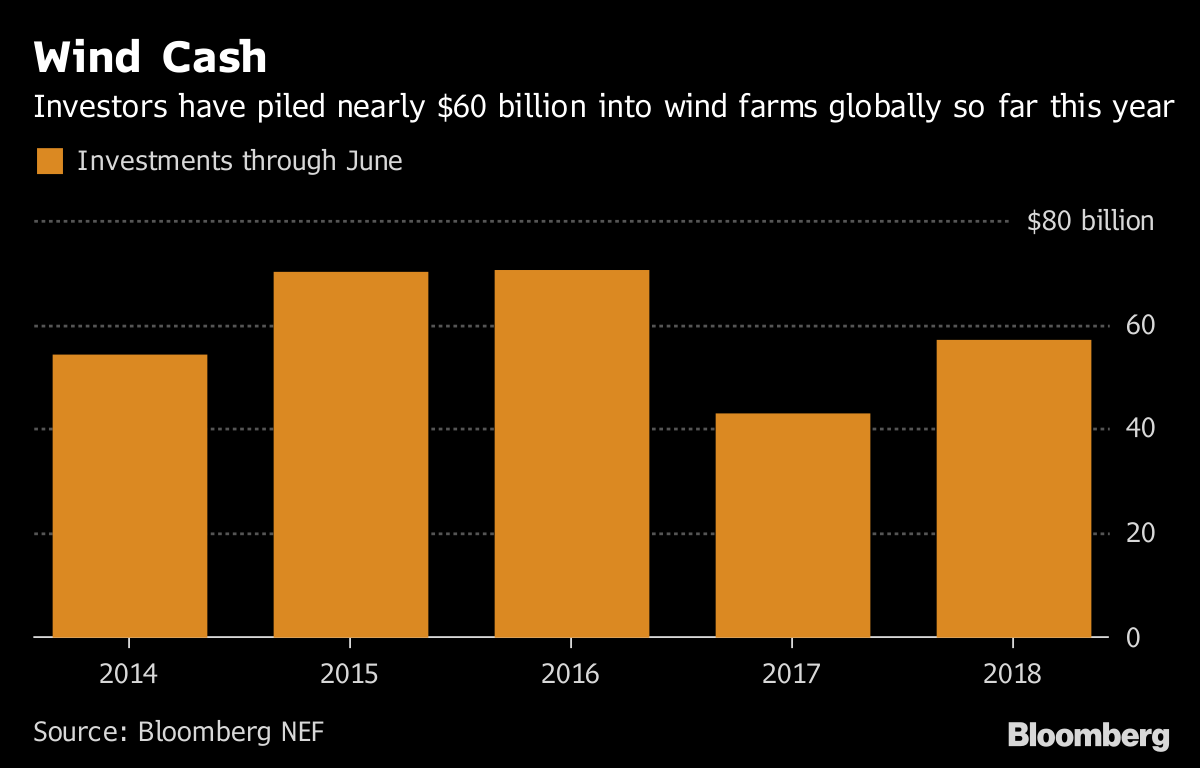 從地區(qū)來看,上半年,美國風(fēng)電投資飆升至175億美元,比2017年上半年翻了一倍多。這是因為開發(fā)商正在努力爭取在2019年之后計劃結(jié)束的聯(lián)邦稅收抵免之前完成投資。