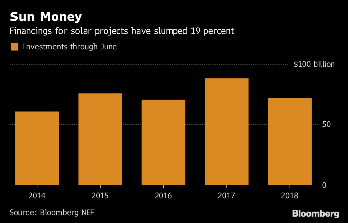 風(fēng)電投資在中國也有所增長,上半年增加到176億美元。太陽能則完全是一個不同的狀態(tài),投資下降29至351億美元。這部分是因為中國政府的“531光伏新政”計劃正在放慢太陽能發(fā)展的步伐。
